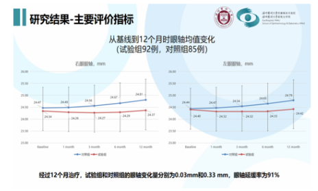 经过12个月治疗,试验组和对照组的眼轴变化量为0.03mm和0.33mm(△AL:IG 0.03mm vs.CG 0.33mm),眼轴增长延缓率为91%;试验组和对照组的屈光度变化量为0.07D和-0.63D(△SER:IG 0.07D vs.CG-0.63D),屈光度增长延缓率111%。