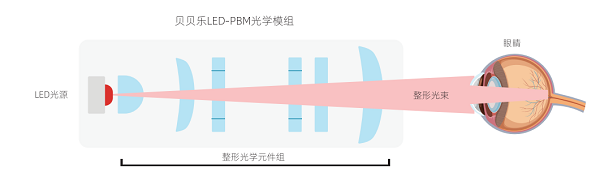 在光路设计上,贝贝乐红光仪器发出中心波长645nm±5nm“黄金波长”的红光光源,经过一系列专业光学元件组整形后,以稳定的功率和波长输出连续、发散、辐照度均匀的出射光束和圆形光斑,经过眼睛屈光系统照射眼底形成PBM近视防控机制。