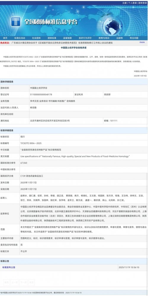 11月19日,由商业饮食服务业发展中心牵头,全国食药同源产业创新工程实施,联合中国国土经济学会精品农业品牌建设专业委员会、中国中医科学院中药研究所、中军创汇(苏州)认证有限公司、北京商国鉴电子技术研究院、北京华夏正通信用评价中心、天津新业态健康科技有限公司、河北千喜鹤饮食股份有限公司、上海合作组织实业家委员会秘书处(北京)项目办、黑龙江生命波碳方会企业总部管理有限公司、上海立润供应链管理集团有限公司、陕西朴道茶业股份有限公司、陕西能脉技术工程研发有限公司、陕西商江芳杰农产品有限公司等多家单位共同起草的《“全国食药同源名优特新产品”标识使用规范》团体标准(T/CSOTE 0004-2025)(以下简称“标准”)在全国团体标准信息平台正式公布。