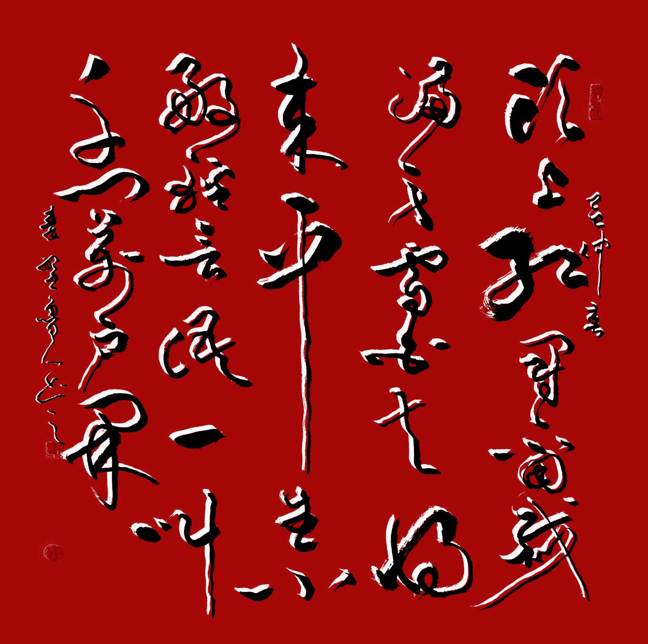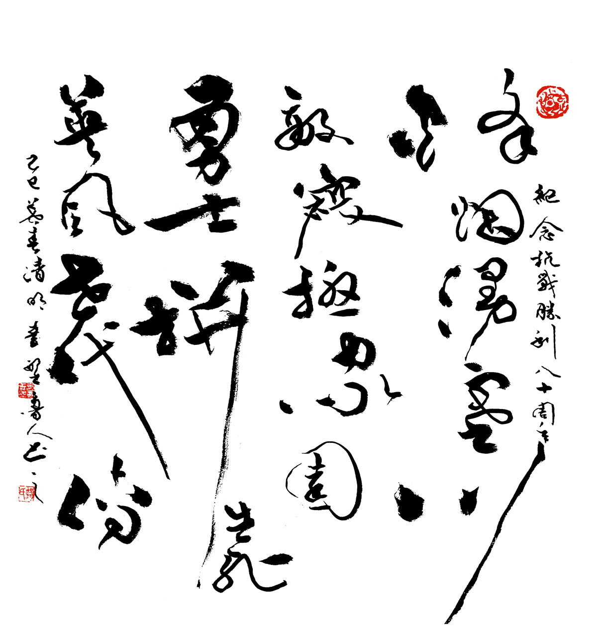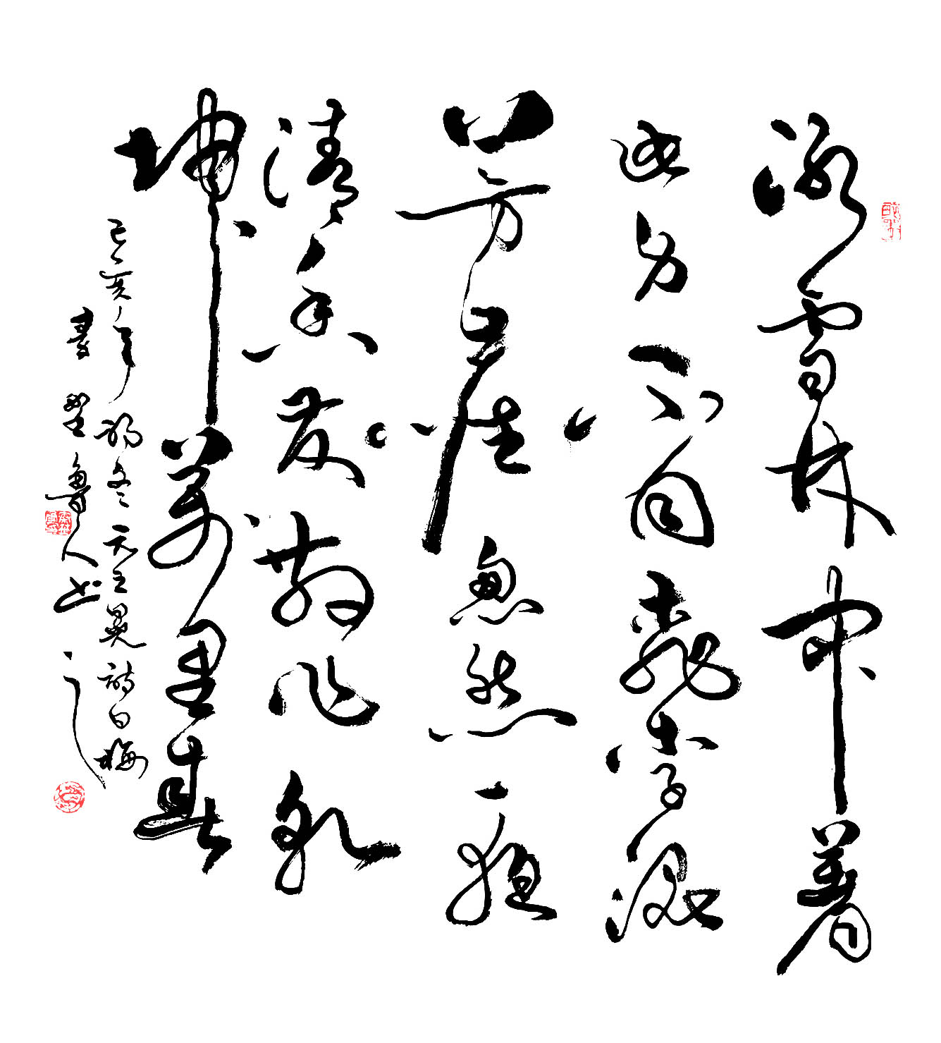 风格融合与创新:在继承传统书法精髓(如王羲之、张旭、怀素等)的基础上,融合个人逸格,形成“劲健秀逸与奔放淋漓兼备”的独特风格。其作品法度森严却气象万千,兼具古风今意,尤以草书见长,代表作《天行健》被誉为“超凡脱俗”的典范。多体兼修:精通行、草、篆、隶、楷五体,作品细腻精致且气韵生动。篆刻亦为所长,治印千余方,刀工老辣意趣高远。