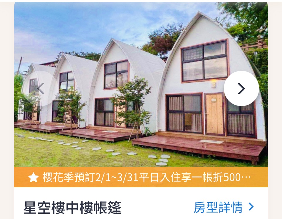 营区提供多种「免搭帐」房型,让旅客可以轻装入住:自然景观:海拔约 1,150 公尺,可欣赏云海、落日夕阳,夜晚无光害可看满天星空。