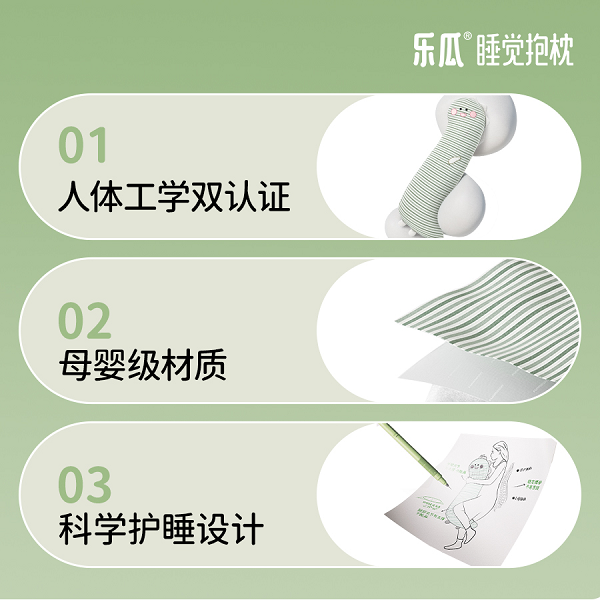 在拥抱之外,FUNMELON乐瓜更需要考量的是睡觉抱枕的实用性。因此,乐瓜睡觉抱枕(Sleeping Hug Pillow)的研发,始终围绕“一人双枕,科学护睡”展开:科学分区的一体式设计,让手腿在睡眠中获得承托,稳定睡姿并维持脊柱生理曲度;三重弹力结构确保使用持久不塌陷;A类婴儿棉给予柔软亲肤触感...这些细节背后,是一套完整的“调-养-护”体系:调整不良睡姿,养护手腿腰背少酸麻,护稳脊柱不偏移。FUNMELON乐瓜相信:“双枕协同”能更好地呵护健康睡姿。