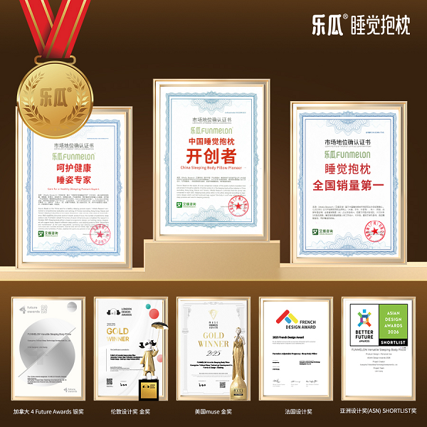 全球市场与国际专业机构的认可赋予了FUNMELON乐瓜持续前行的信心。先后获评2024年度“全国销量第一”“中国睡觉抱枕开创者”“呵护健康睡姿专家”等市场地位认证。在设计领域,乐瓜睡觉抱枕(Sleeping Hug Pillow)接连荣获美国好设计奖、法国设计奖、美国MUSE设计奖、伦敦设计奖、4 Future Awards及亚洲设计奖等多项国际大奖,并于2025年入选厦门红点设计博物馆常设展。这些荣誉背后,是国际对FUNMELON乐瓜设计创新力与品牌人文价值的双重认可,也印证了其以“拥抱”为载体、推动情感联结的品牌理念正在全球范围内引发共鸣。