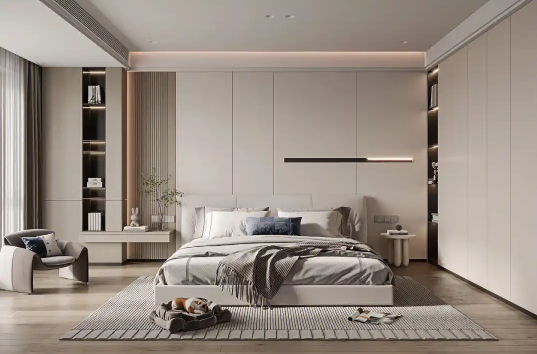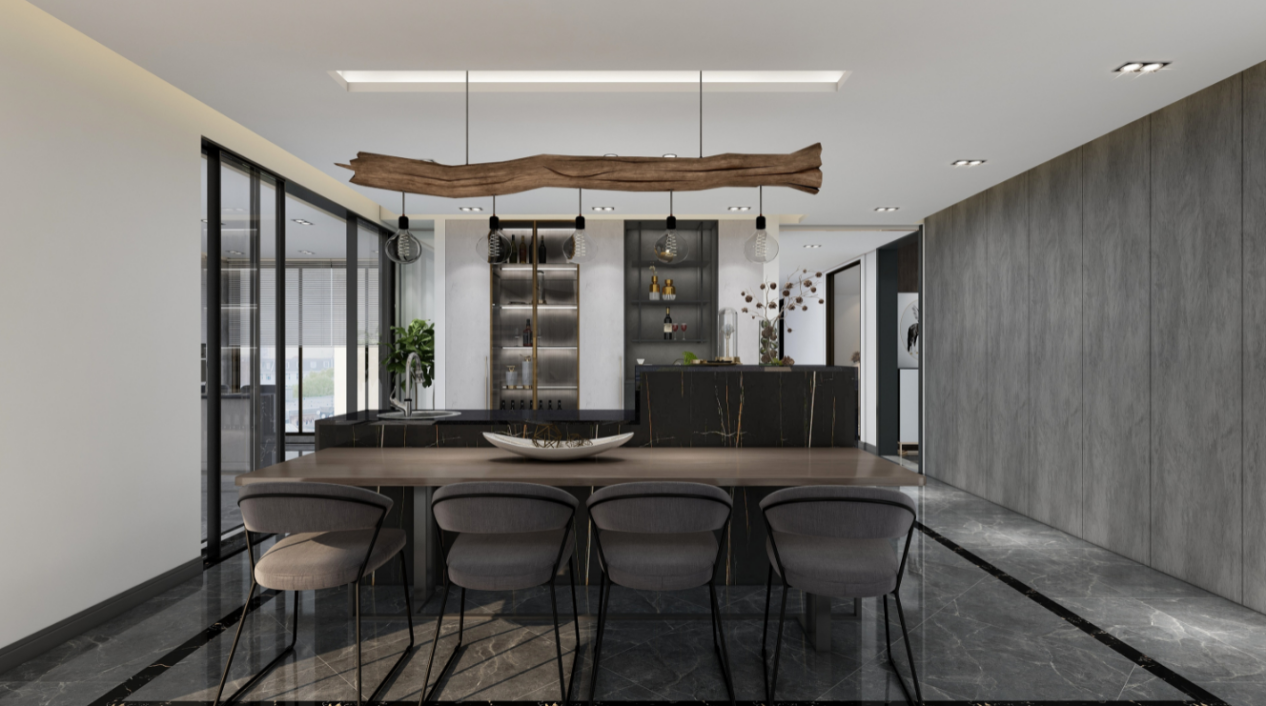 在设计师看来,共享空间越多,空间的松弛感越明显,趣味性越强烈,情绪价值越丰满,居住体感越舒适。基于深入的了解,探索饮食习惯对空间营造的影响。本案的家庭成员结构较为简单,常以轻食简餐为主,故而舍弃了构建中厨的想法,从和谐的社交属性切入,打造开放、共享的餐厨一体化场域。