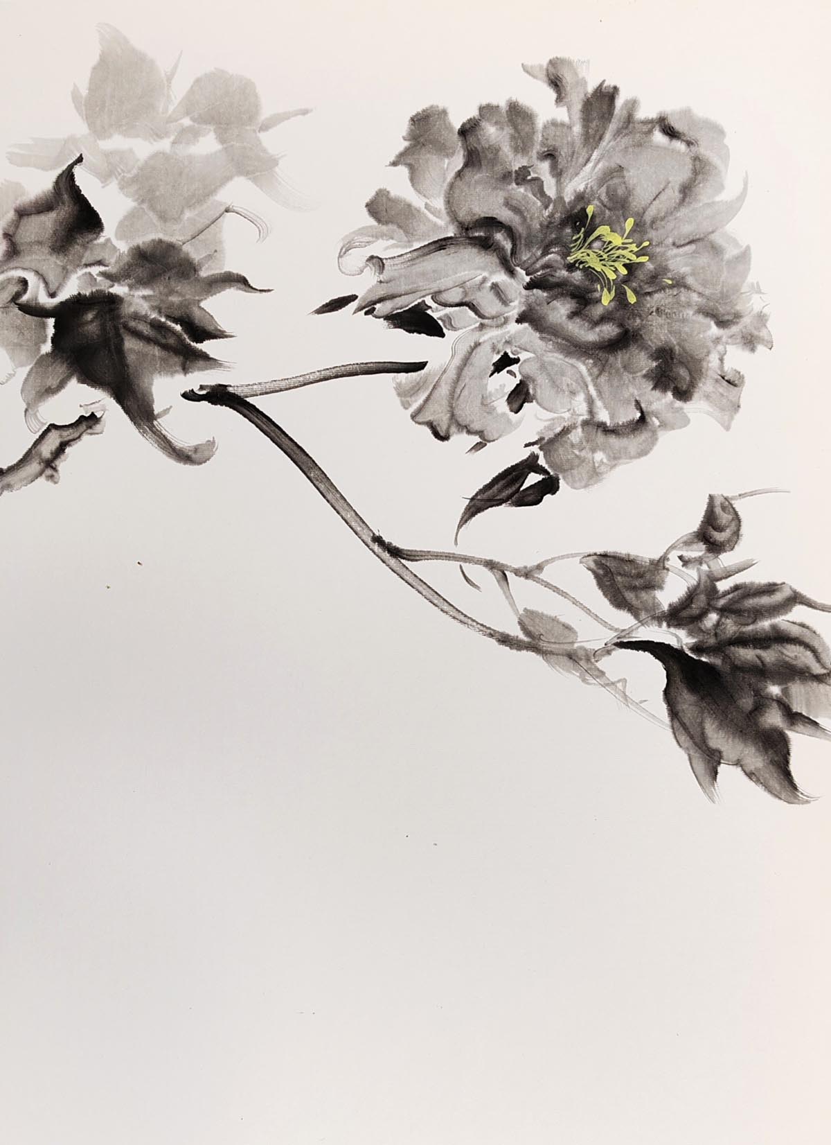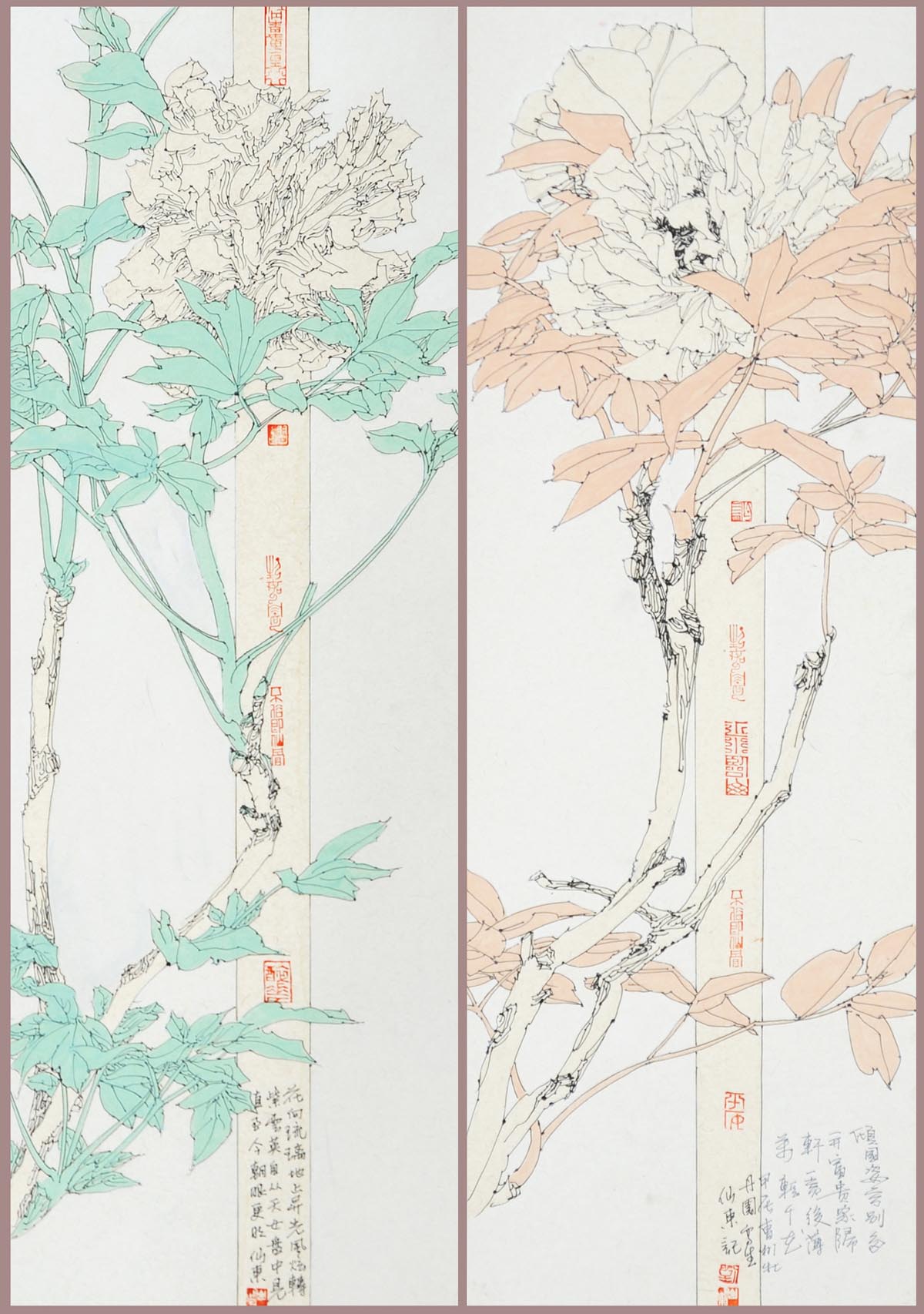 5.在25年的写生时,观察面前的牡丹在树影斑驳的光晕下呈现一种特殊的光感美,但在纸上很难去表现,直到写生快结束时才试验出光斑处大胆留白的方法来表现光感,效果还不错,这种表现手法历史上并没有,但个人觉得,只要能表现牡丹的美,任何方法都应该大胆尝试。